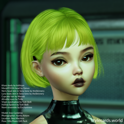 In Second Life, Inez uses the Inithium Khara body along with the Genus MorphTOON head. For skins, she uses theSkinnery Neris for the head and theSkinnery Luna for her body. Normally she uses Rama Salon Erika hair, which is very black and luxurious. Her eyes are Tville Afrodite.