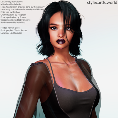 In Second Life, Kalyani uses the Maitreya Lara and LaraX bodies with a LeLutka Milan head. For a long time, she used these with theSkinnery's BOM Body and Missy skins, but in late 2024 she changed to their Luna and Misia skins in Brownie tone.