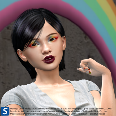 In Second Life, Venus uses Lara Petite and LaraX Petite bodies from Maitreya along with a Halle head from LeLutka. She uses these with the Luna body skin from theSkinnery and theSkinnery's Rita, both in Champagne tone.
