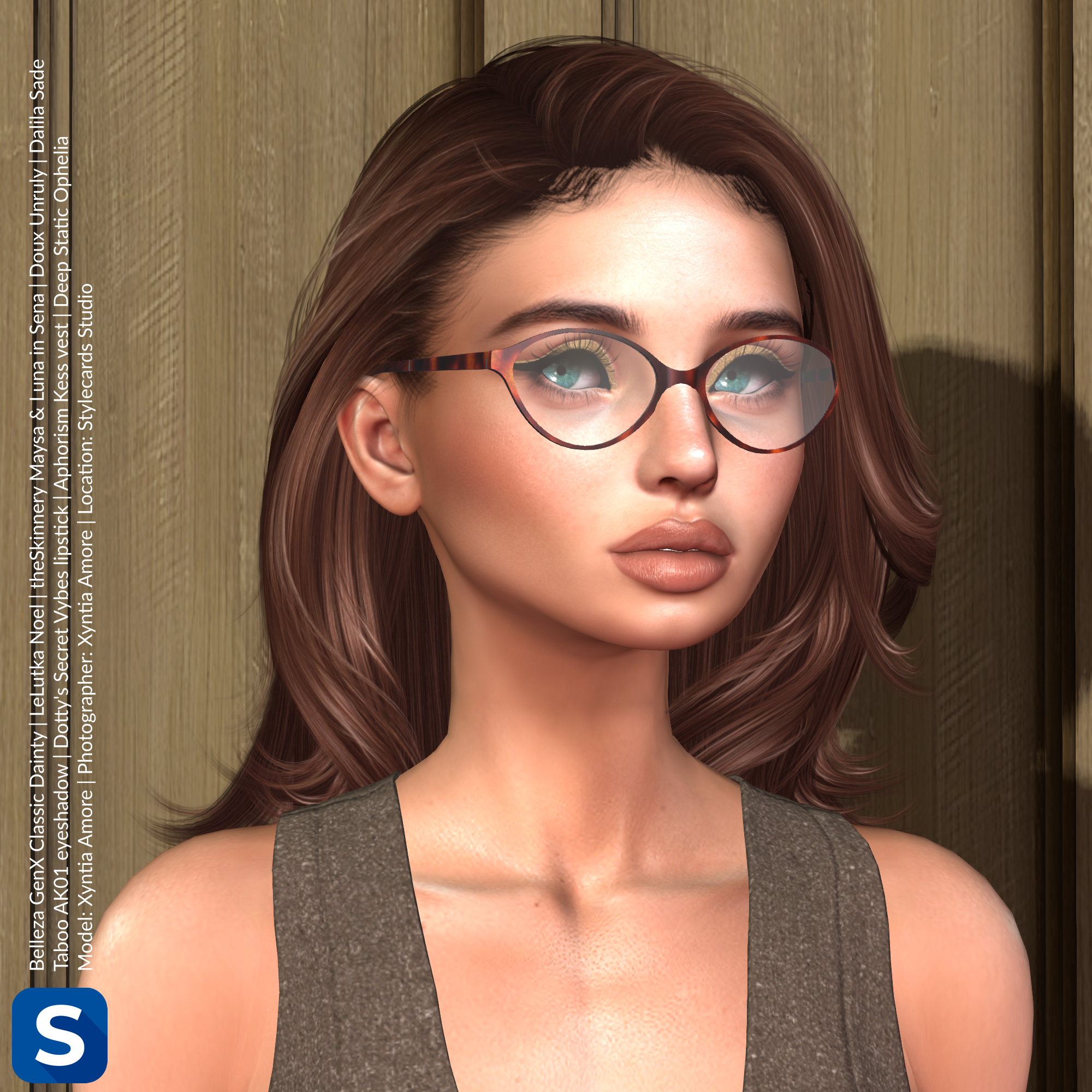 Caption: A headshot of Xyntia Amore as she tries some of the texture options for her eyeglasses from Deep Static.