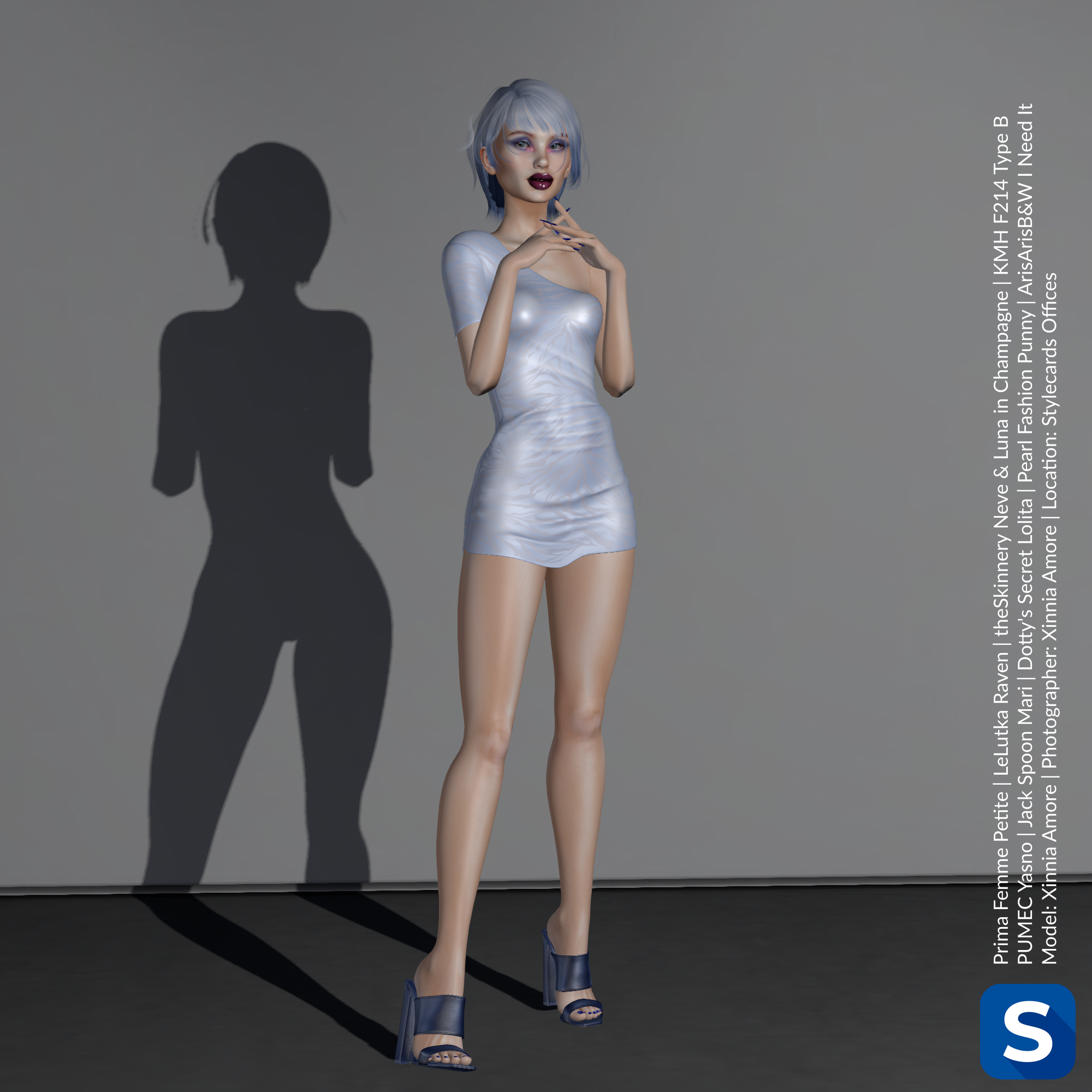 Alt: A full shot of Xinnia Amore standing in front of a grey wall. As she is lit from the front, her shadow appears on the wall behind her. Her feet are shod in dark blue high heels, while her torso bears a light blue asymmetric mini dress. Her hair is short and light blue/dark blue ombre, matching her attire. She has glossy plum colored lipstick from Dotty’s Secret and dark blue eyeshadow from Jack Spoon.